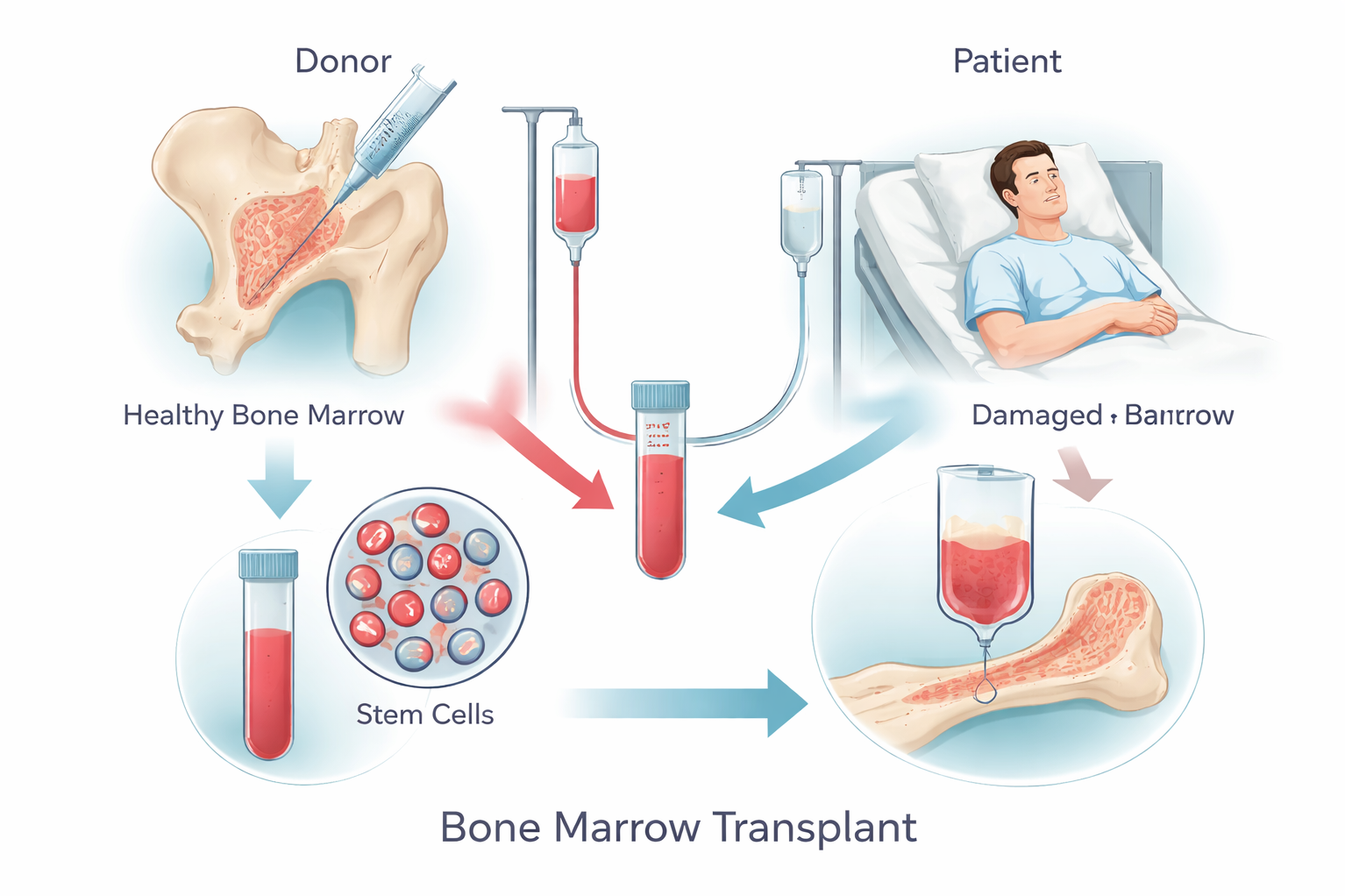Bone marrow transplants can be autologous (using your own cells) or allogeneic (using cells from a donor). The process begins with chemotherapy or radiation to prepare your body for the transplant, followed by the infusion of healthy stem cells to promote the growth of new blood cells.